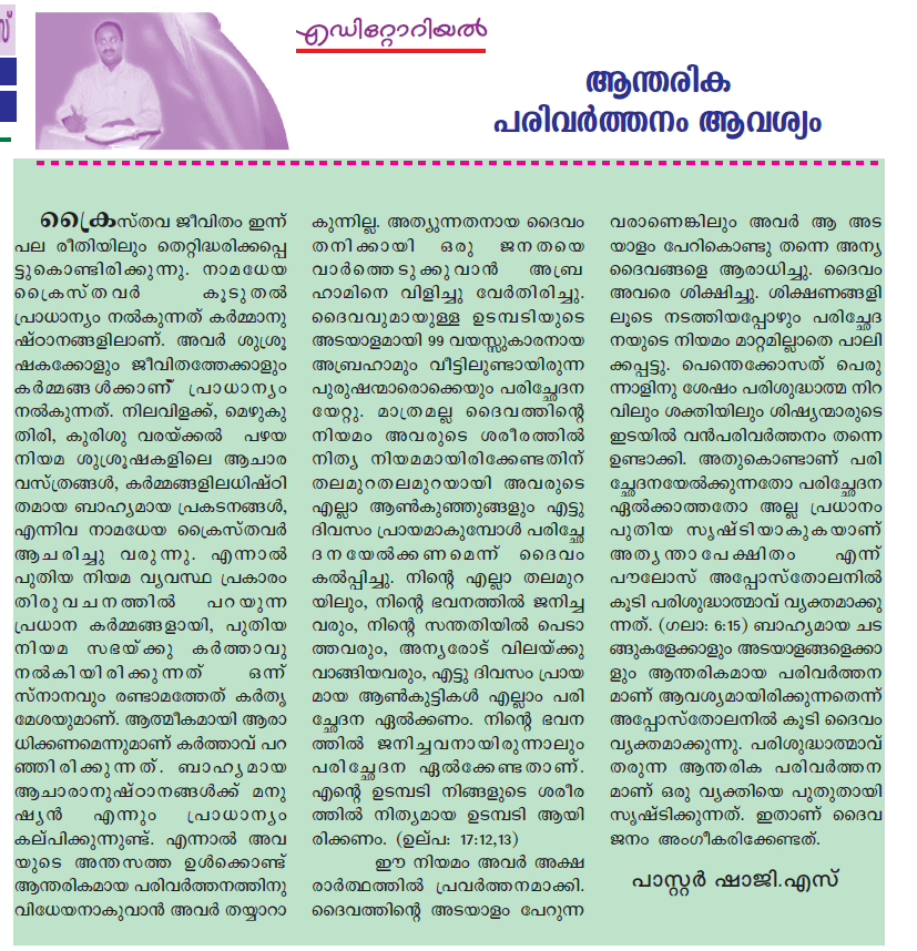 പരിശുദ്ധാത്മാവ് തരുന്ന ആന്തരിക പരിവര്ത്തനമാണ് ഒരു വ്യക്തിയെ പുതുതായി സൃഷ്ടിക്കുന്നത്. ഇതാണ് ദൈവജനം അംഗീകരിക്കേണ്ടത്.